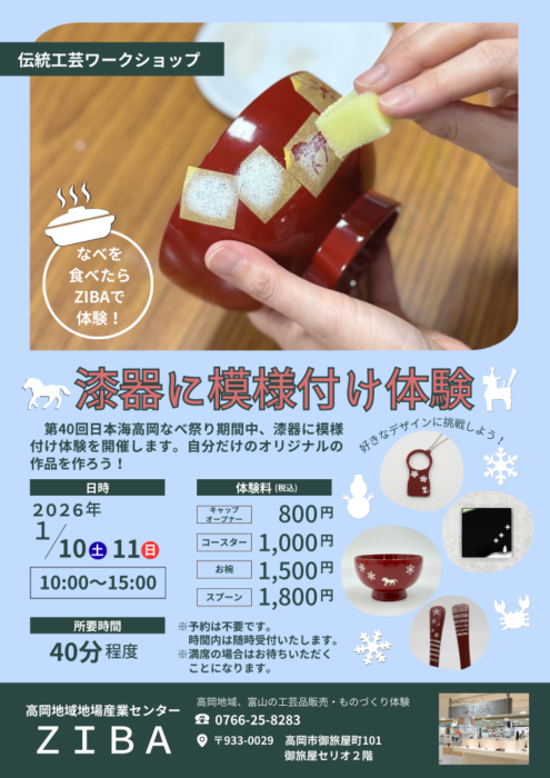 第40回日本海高岡なべ祭り期間中、ZIBAものづくり体験 “漆器に模様付け”を開催します。